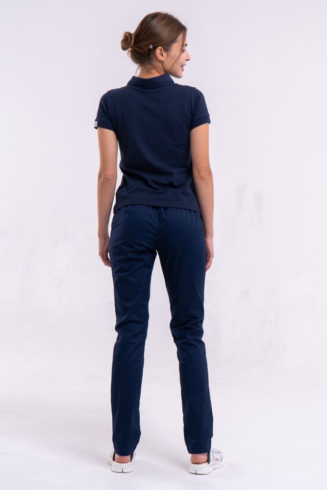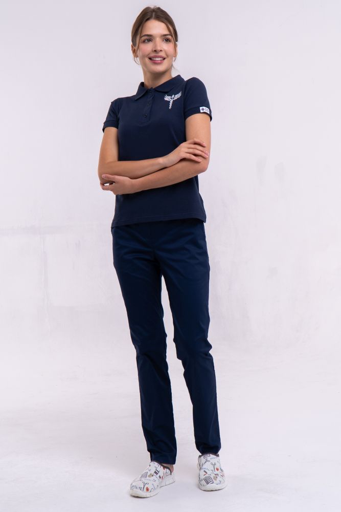 На фото: поло медичне жіноче синє з вишивкою Кадуцей + брюки медичні жіночі темно-сині Торонто