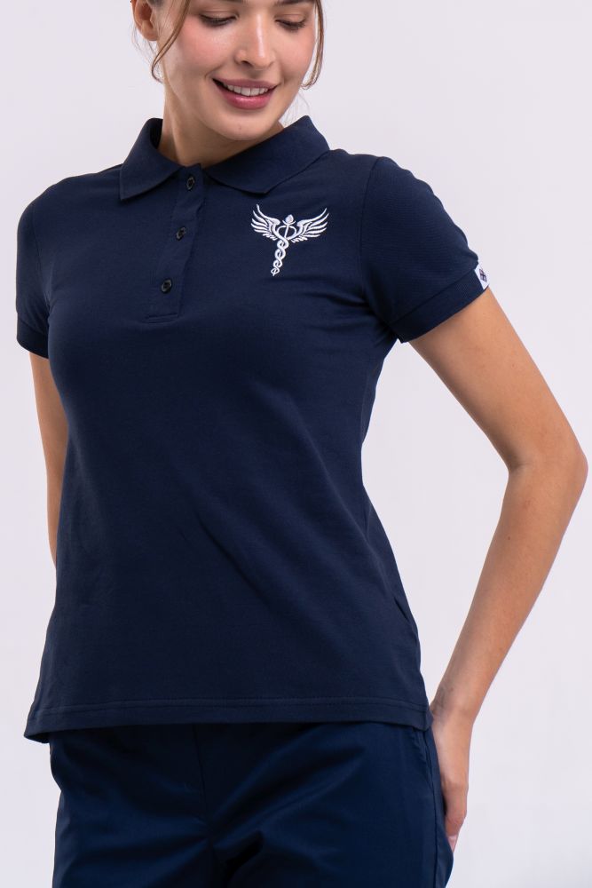 Медичне поло жіноче з вишивкою: трикотажна сорочка напівприталеного фасону з коротким рукавом. Має класичний неглибокий виріз, оброблений вшивними планками й доповнений трьома ґудзиками. Виріз горловини обрамлений м'яким трикотажним відкладним сорочковим коміром.
