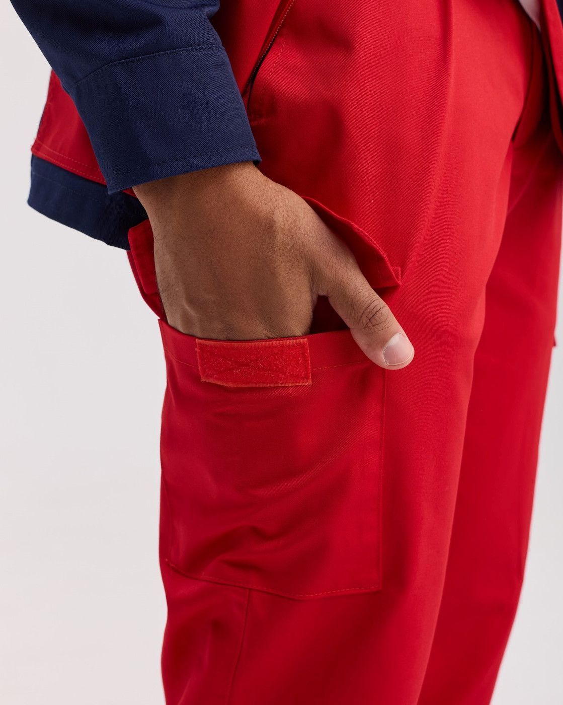 Брюки класичного крою, зверху на гумці, з бічними кишенями біля поясу та накладними кишенями з клапанами, вище колін.