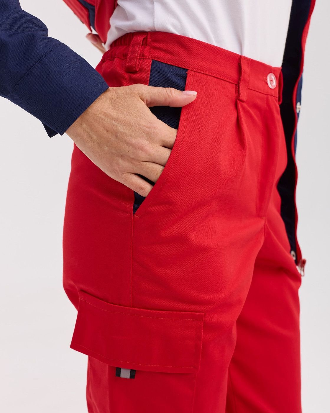 Брюки класичного крою, зверху на гумці, з бічними кишенями біля поясу та накладними кишенями з клапанами, вище колін.