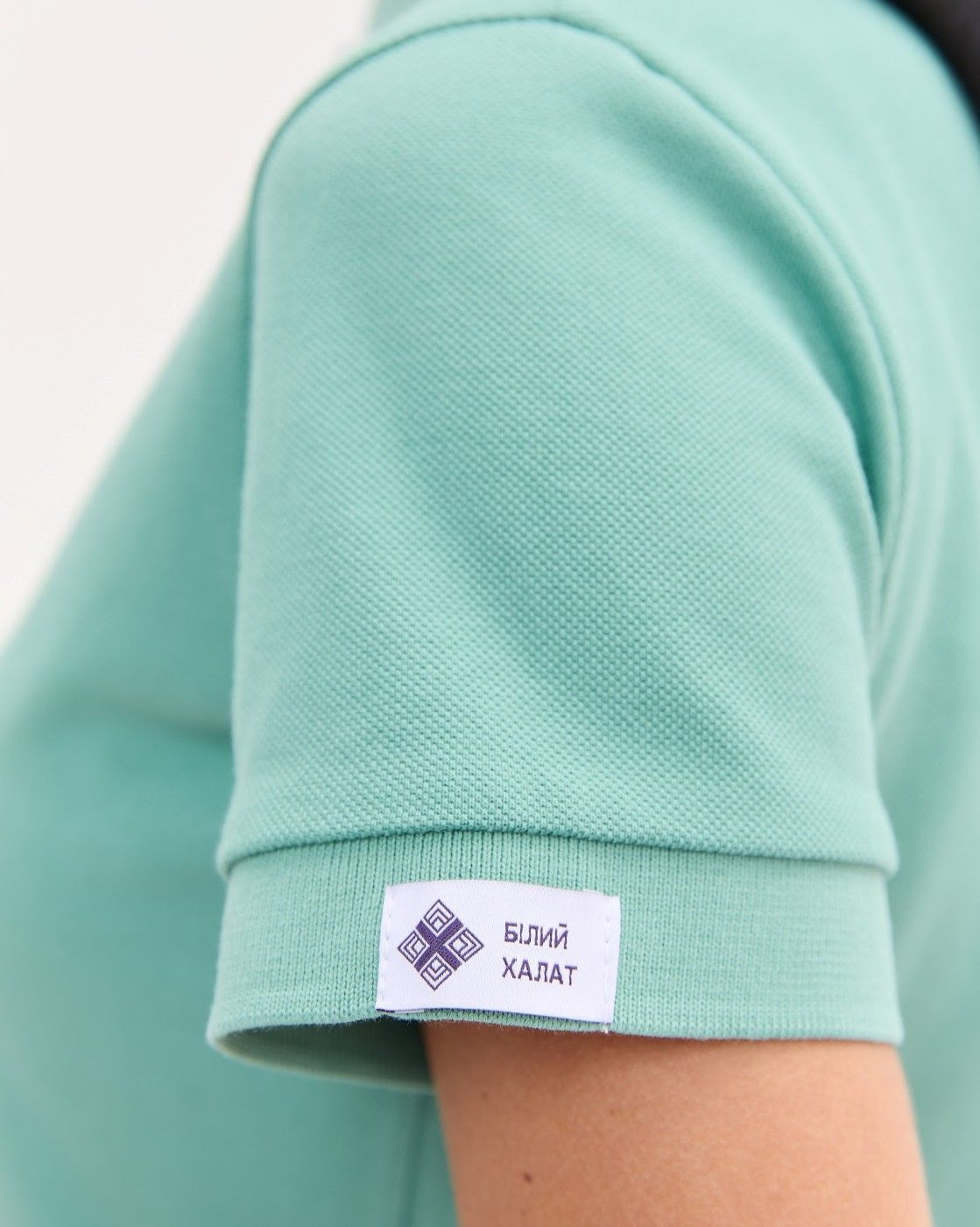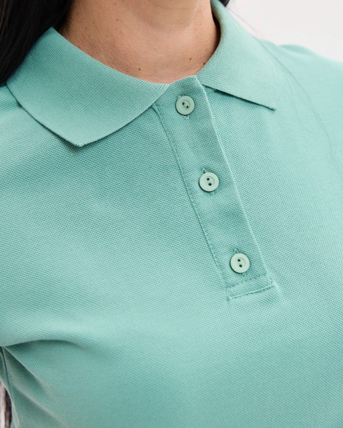 Поло має класичний комірець, ґудзики та короткий рукав.