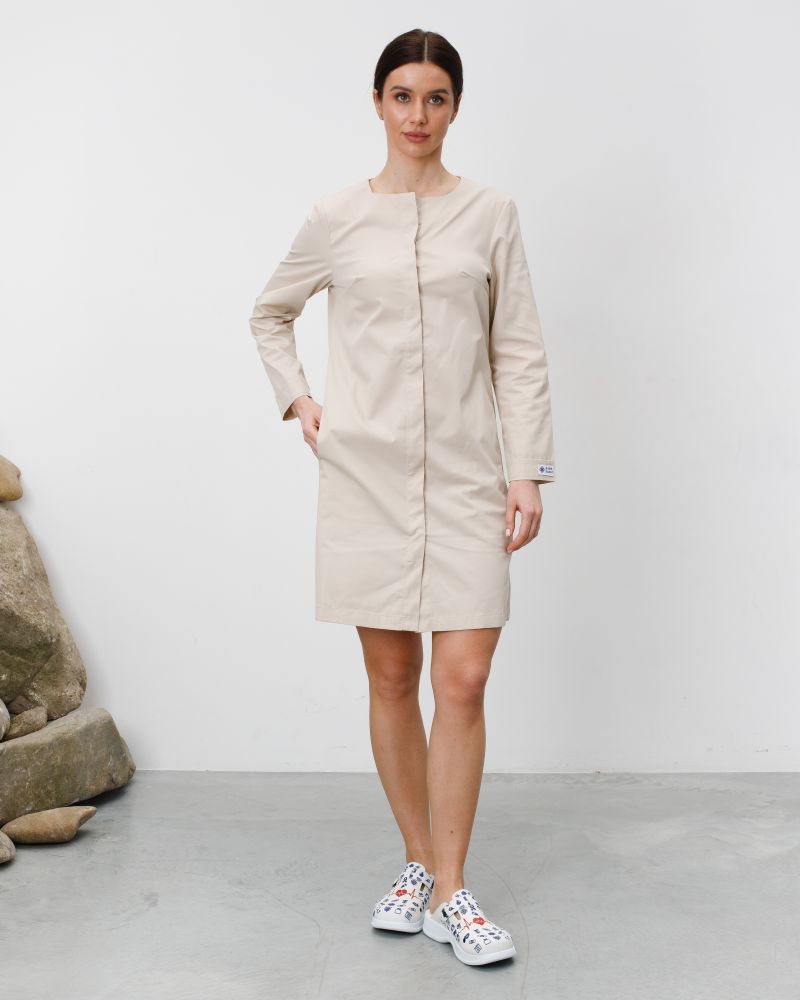 Напівприталений халат довжиною до колін. Практична довжина рукава 7/8, лівий рукав декорований брендованою нашивкою. Халат застібається на ряд потаємних ґудзиків, виріз горловини – у формі напівчовника. Є 2 кишені.