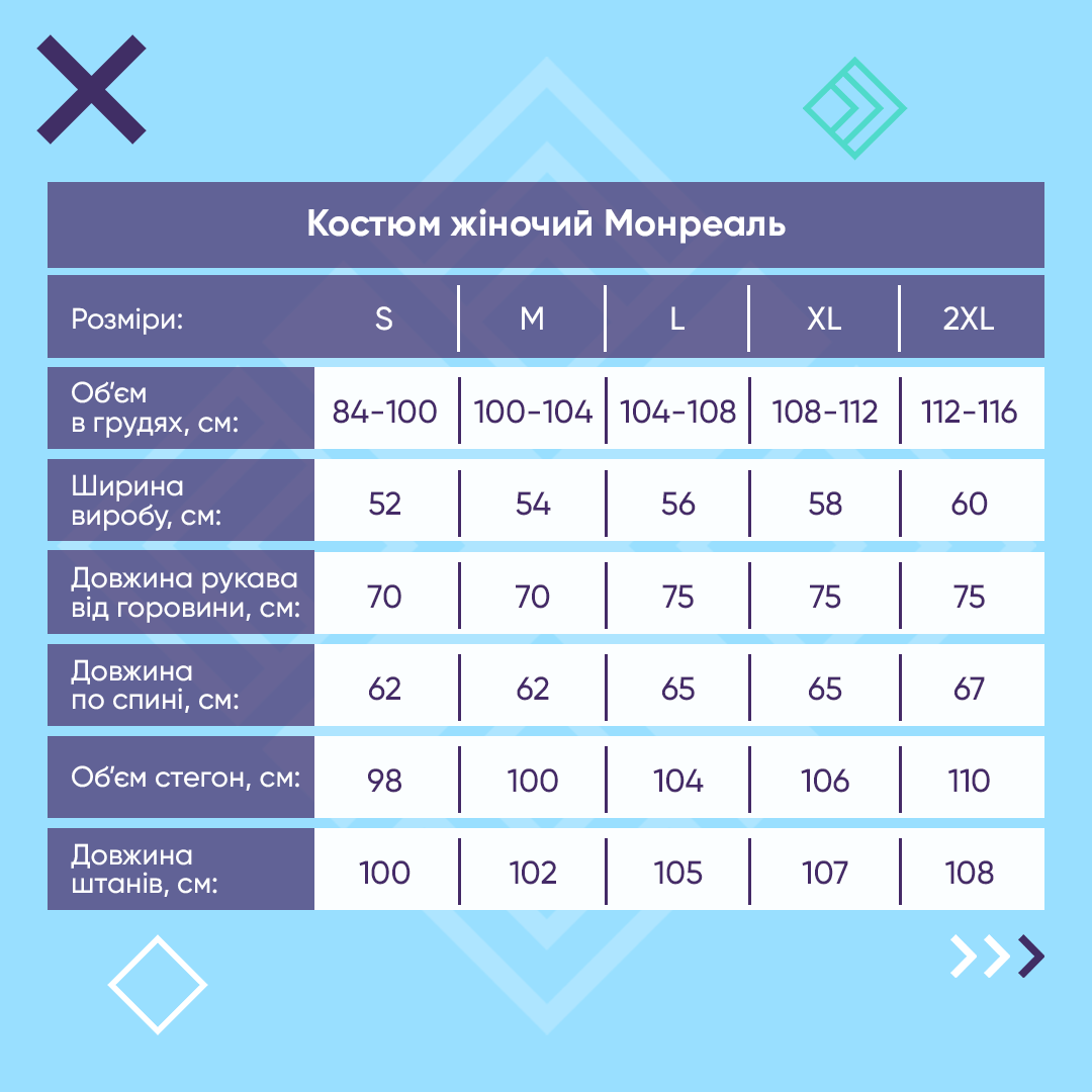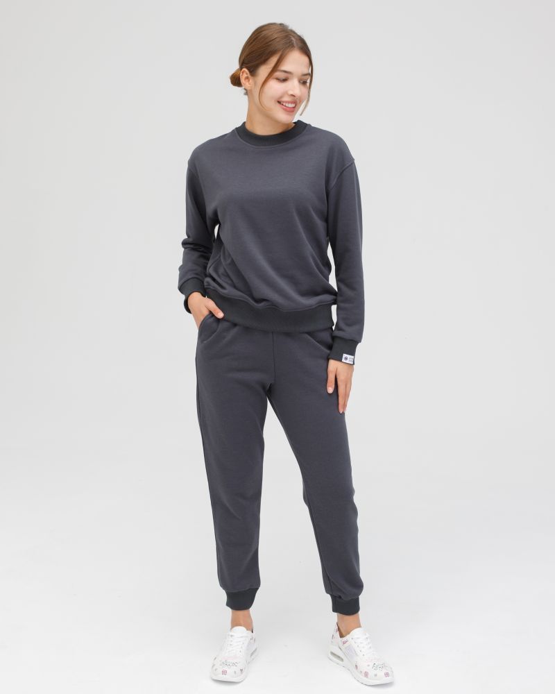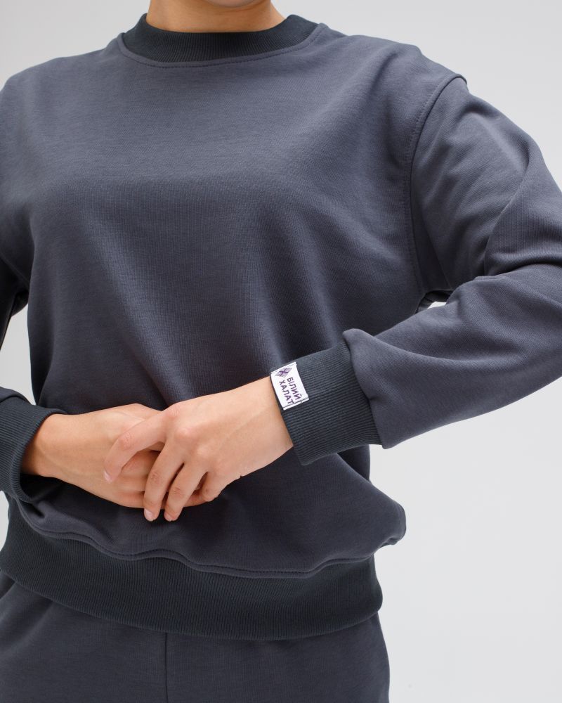 Складається із медичного світшота та штанів. Жіночий костюм вільного силуету, штани з втачними кишенями на манжетах, пояс на резинці з регулюючим шнурком; кофта з круглим вирізом, довгі рукави з опущеним плечем на манжеті, низ кофти на манжеті.