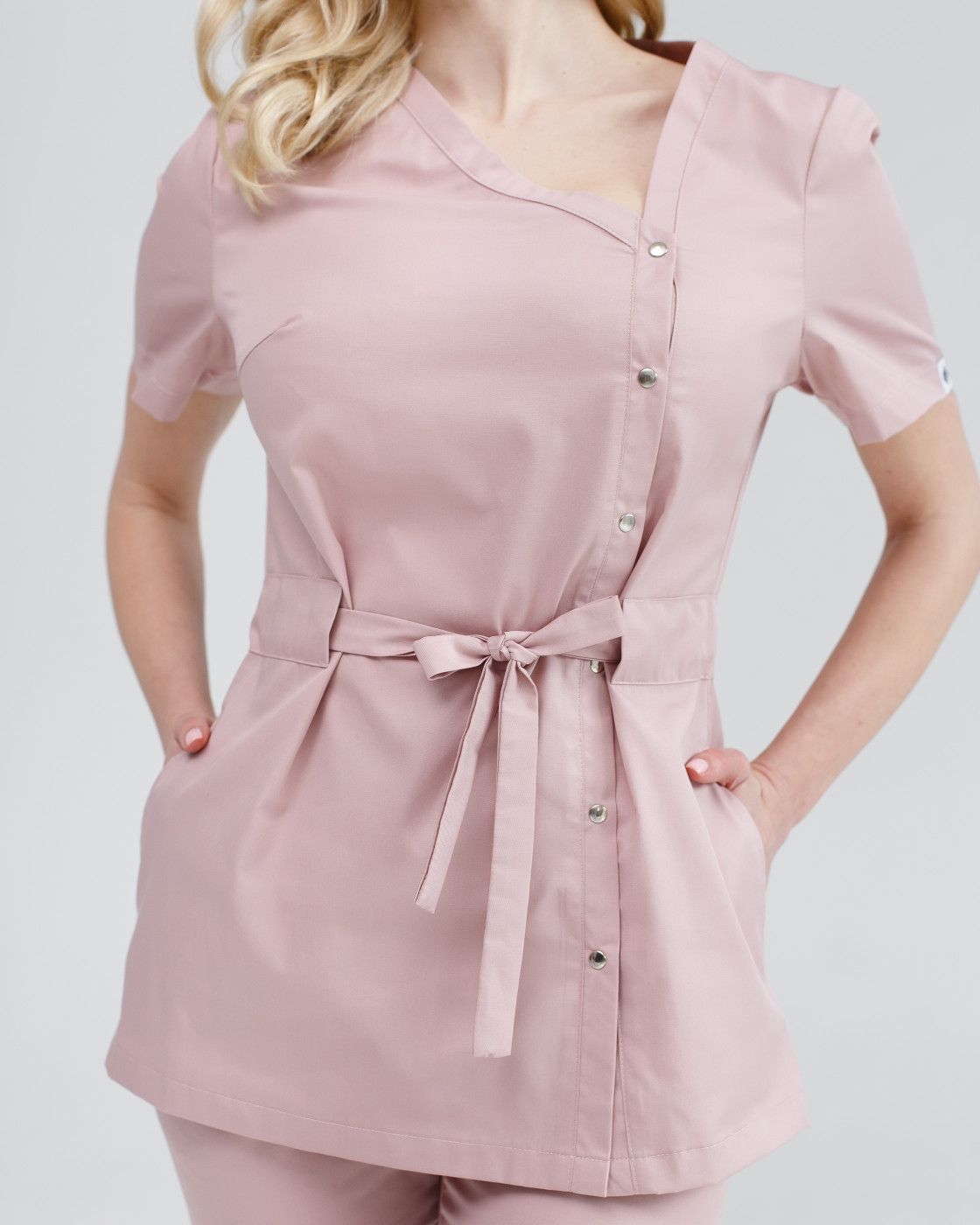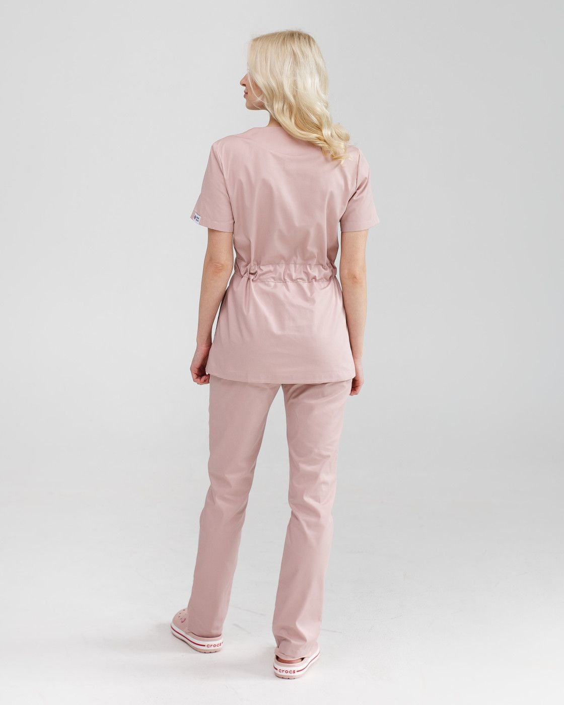Костюм складається з медичної сорочки на кнопках та штанів. Сорочка має оригінальний асиметричний виріз горловини, короткі рукави, застібається на ряд кнопок. Талію підкреслює пояс-куліска. Низ — штани прямого фасону з еластичною резинкою на талії та двома кишенями.