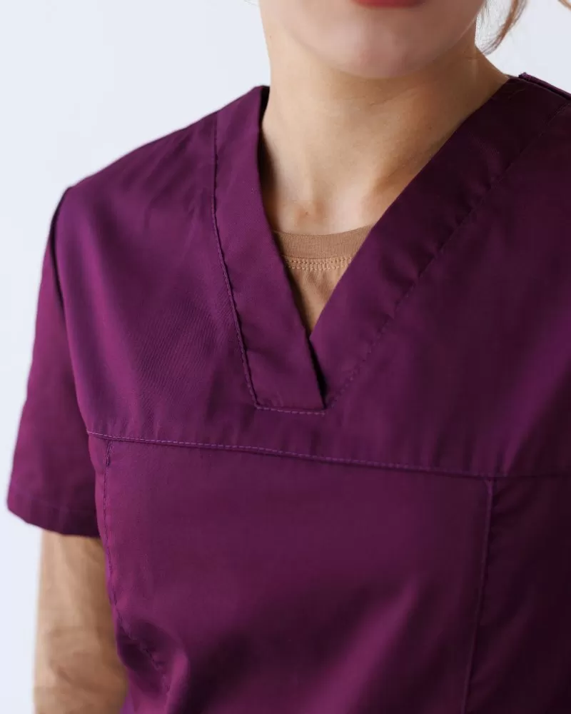 На фото: Медицинский женский костюм Топаз фиолетовый + Медицинский лонгслив женский песочный