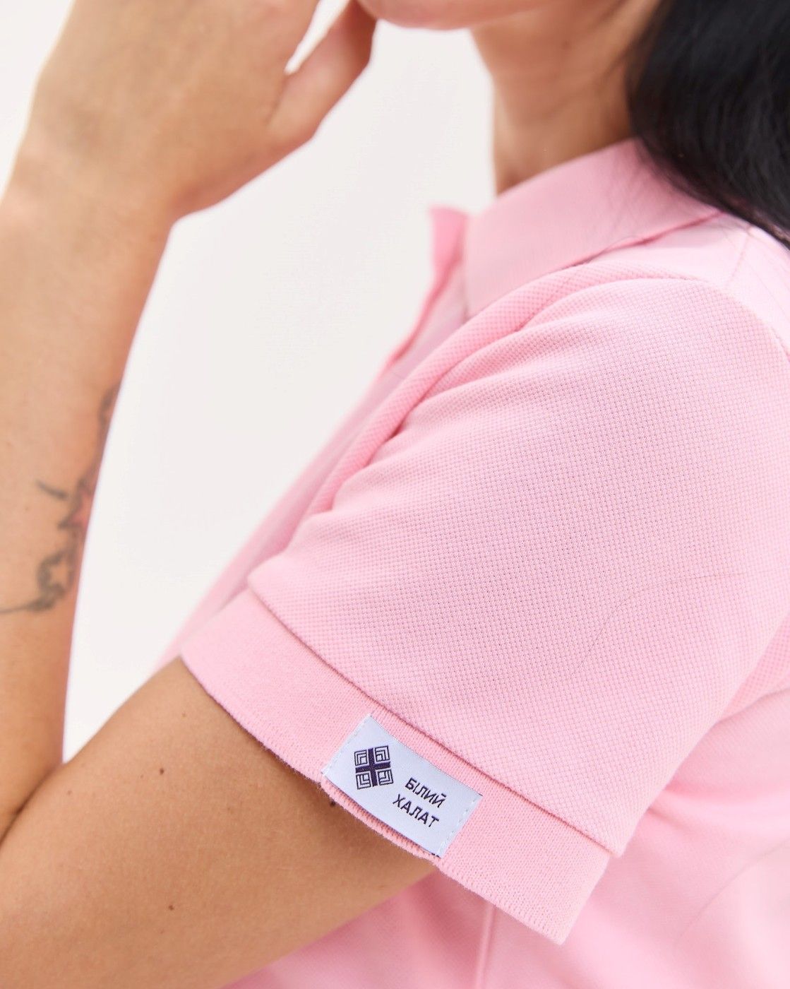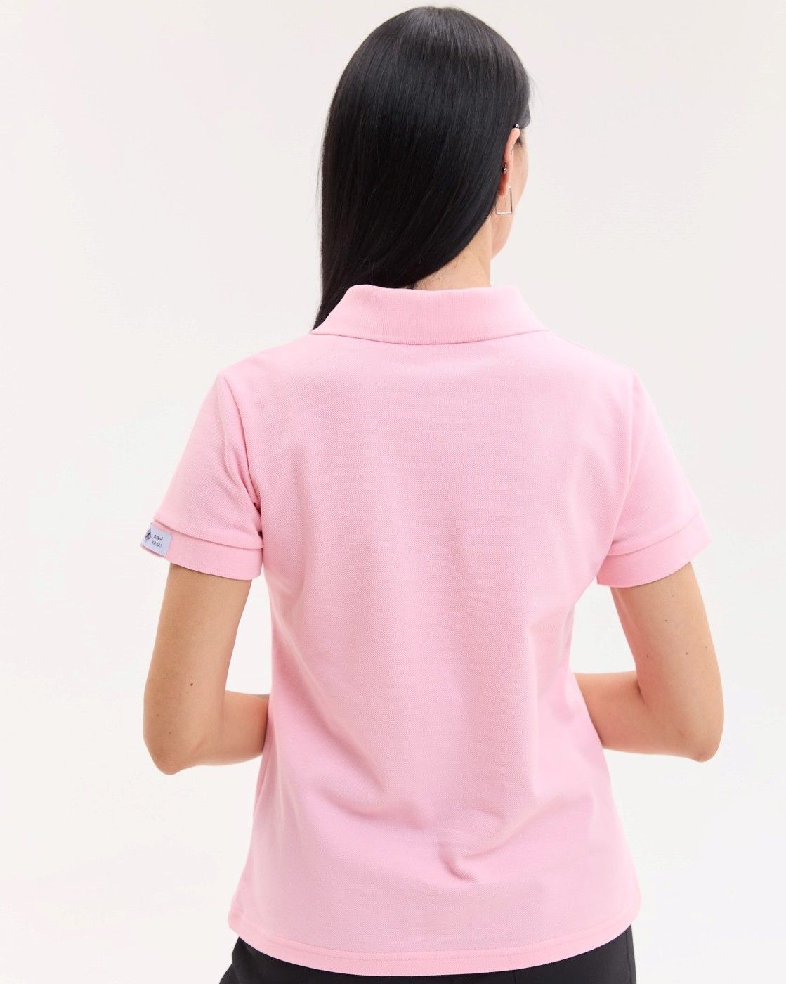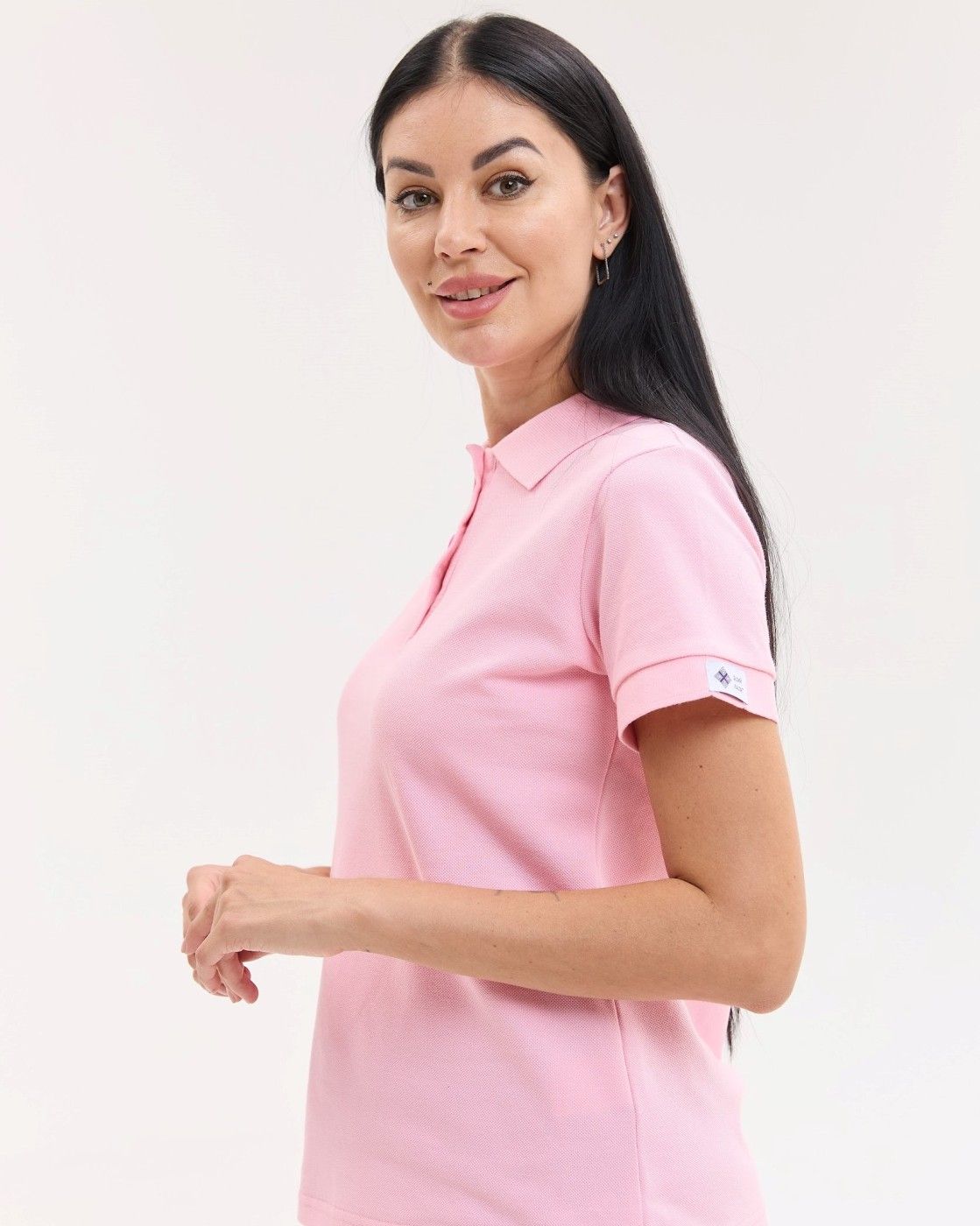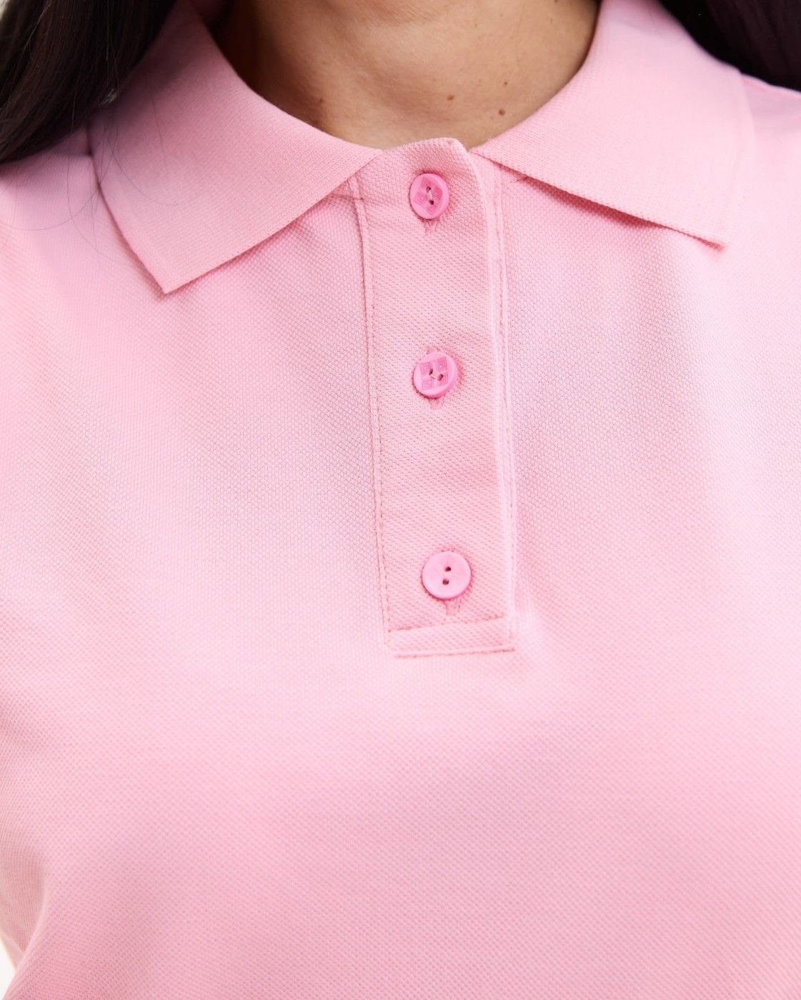 Поло имеет классический воротничок, пуговицы и короткий рукав.