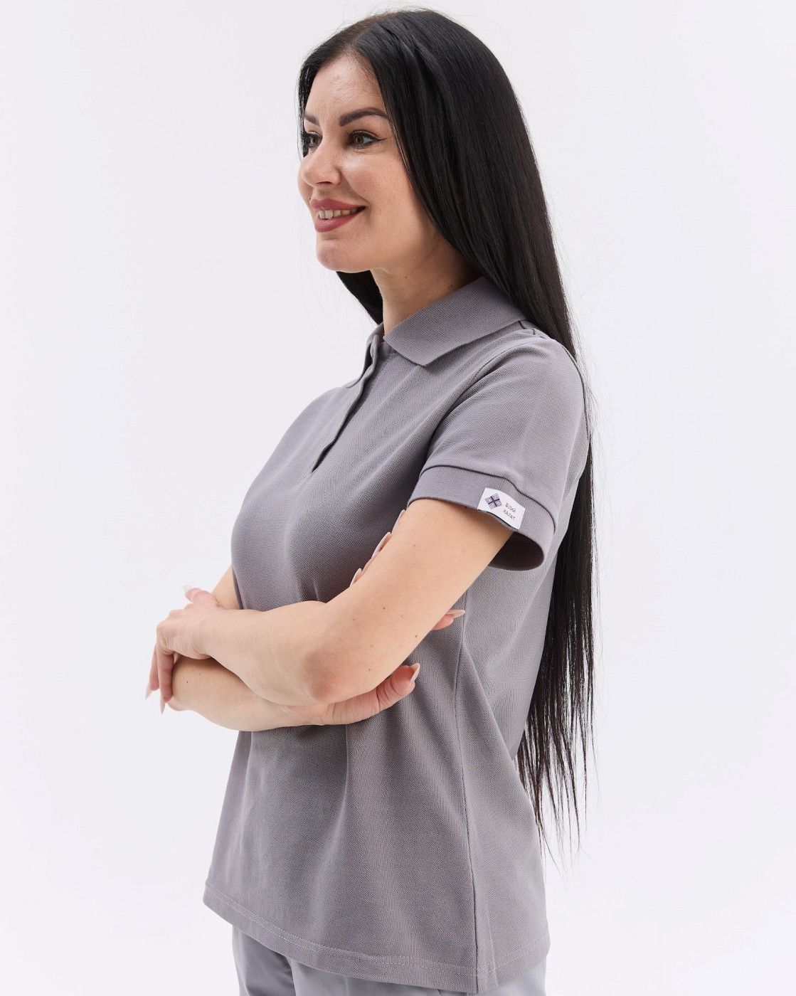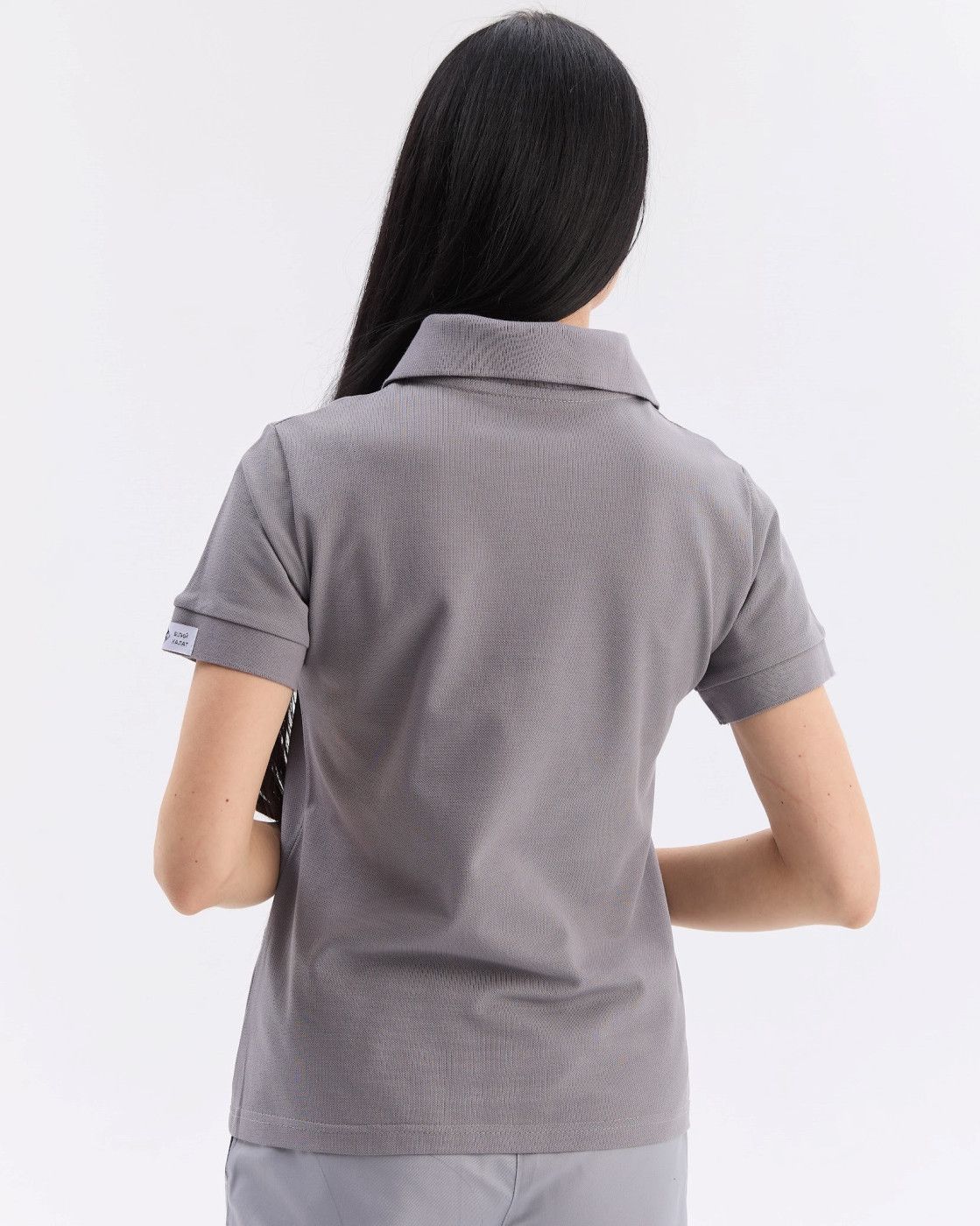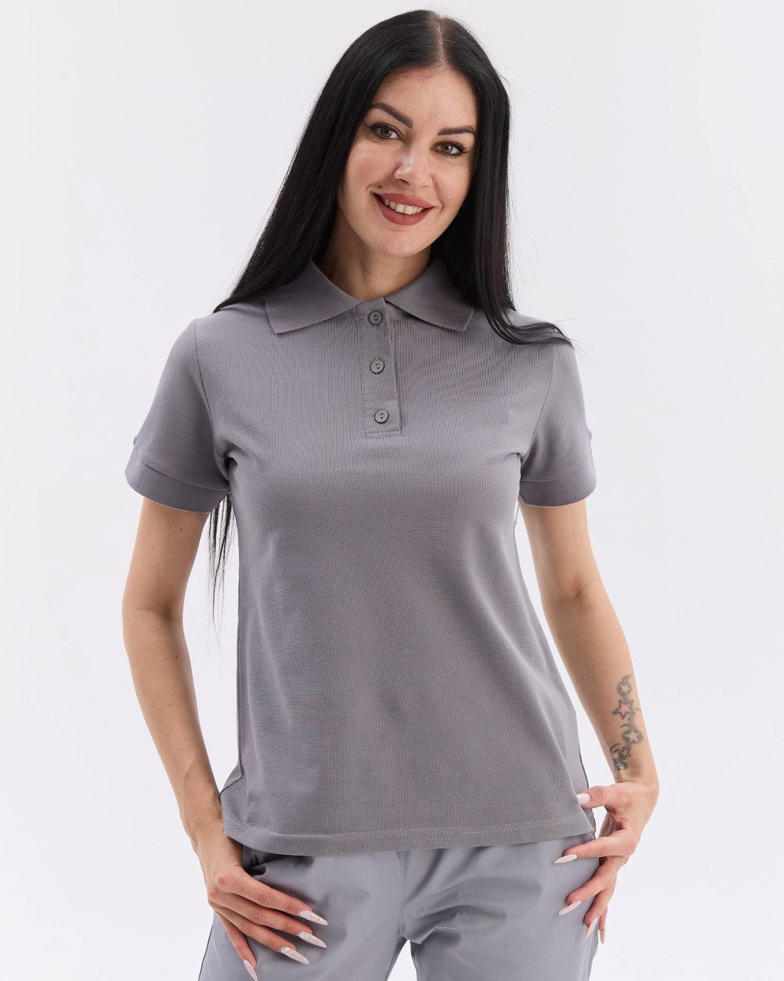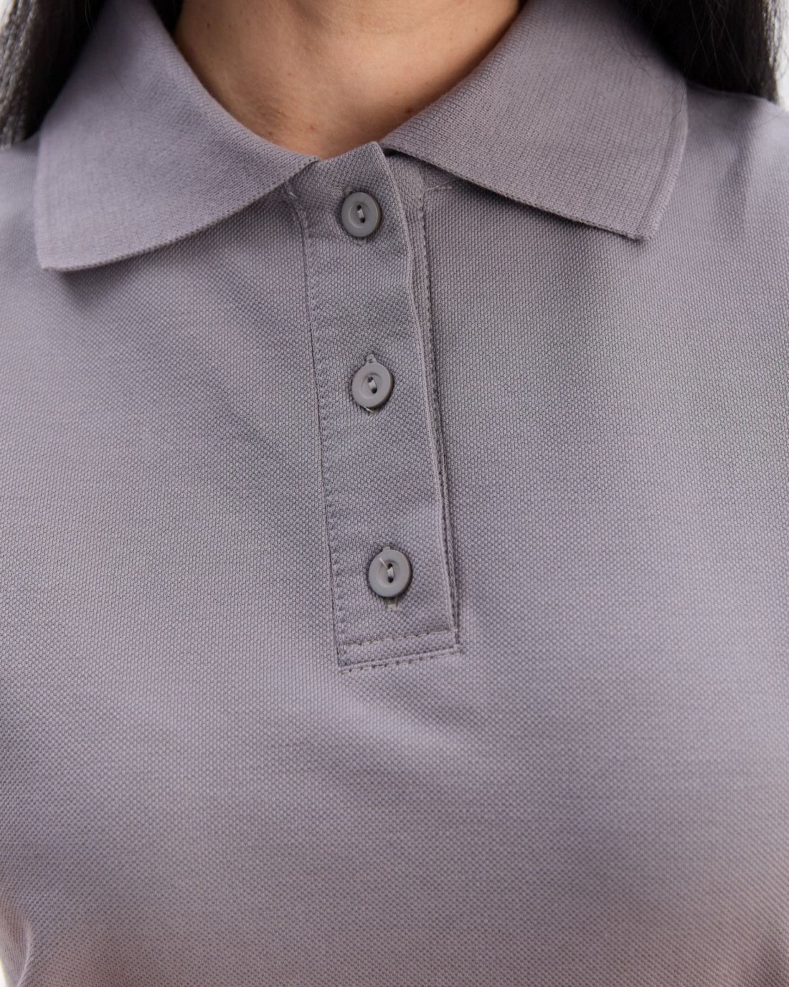 Поло имеет классический воротничок, пуговицы и короткий рукав.