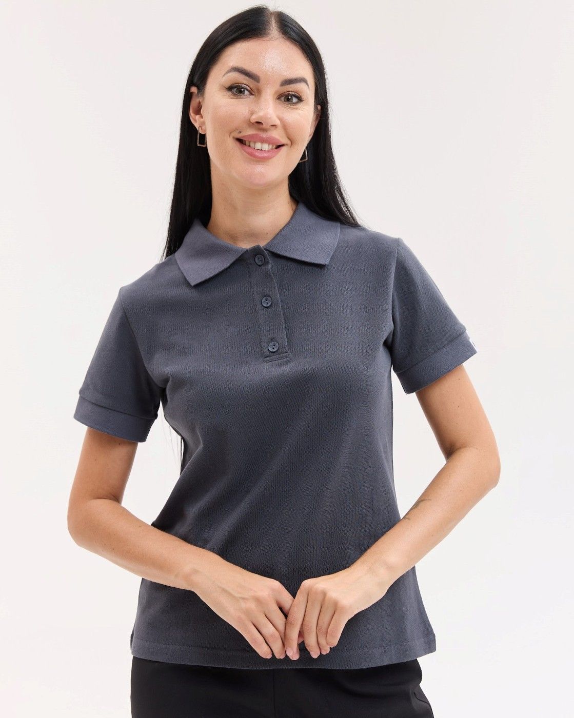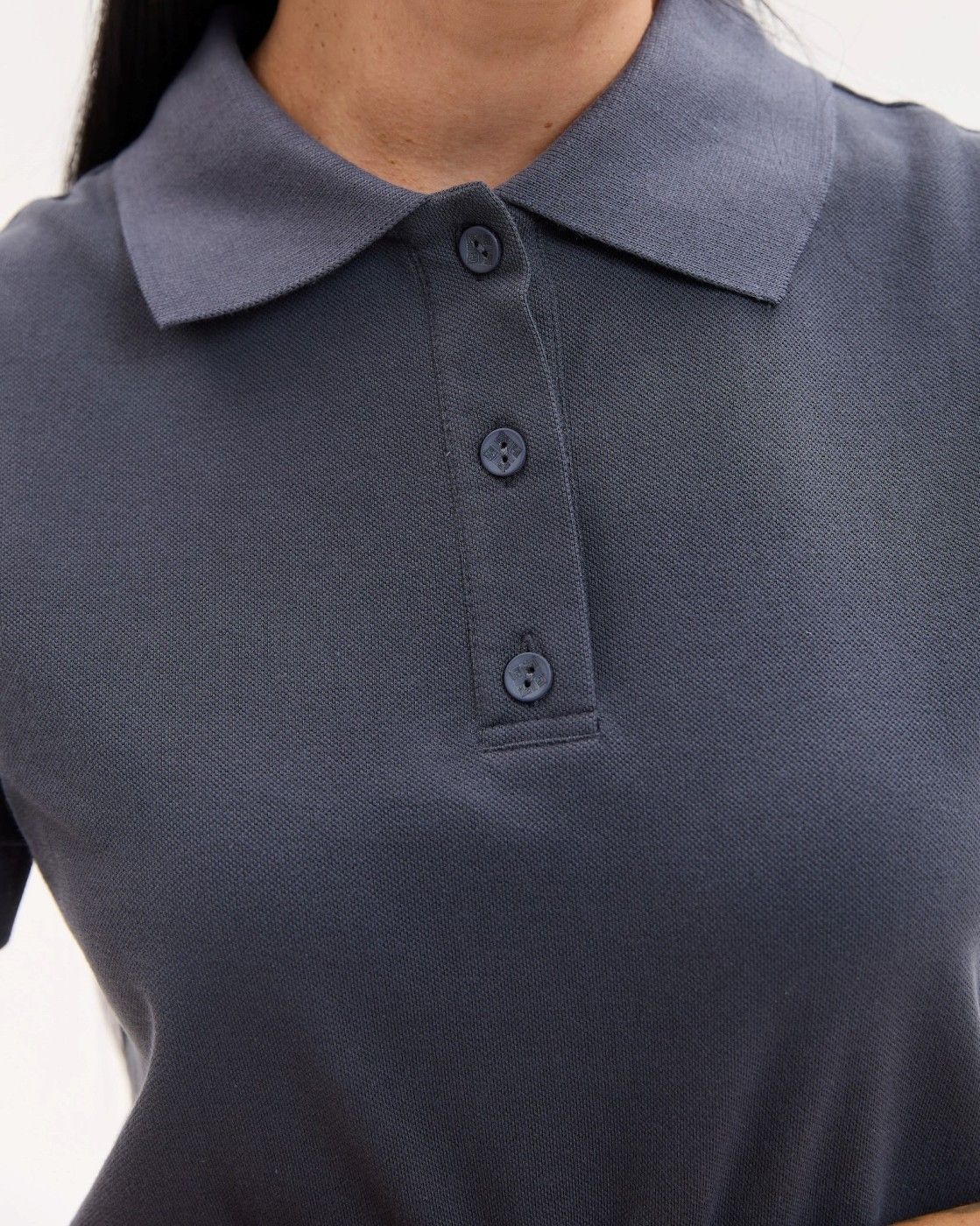 Поло имеет классический воротничок, пуговицы и короткий рукав.