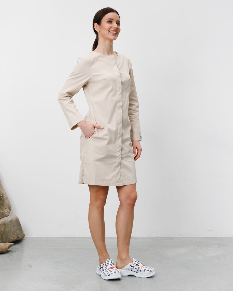 Полуприталенный халат длиной до колен. Практичная длина рукава 7/8, левый рукав декорирован брендированной нашивкой. Халат застегивается на ряд потайных пуговиц, вырез горловины - в форме полулодочки. Имеется 2 кармана.