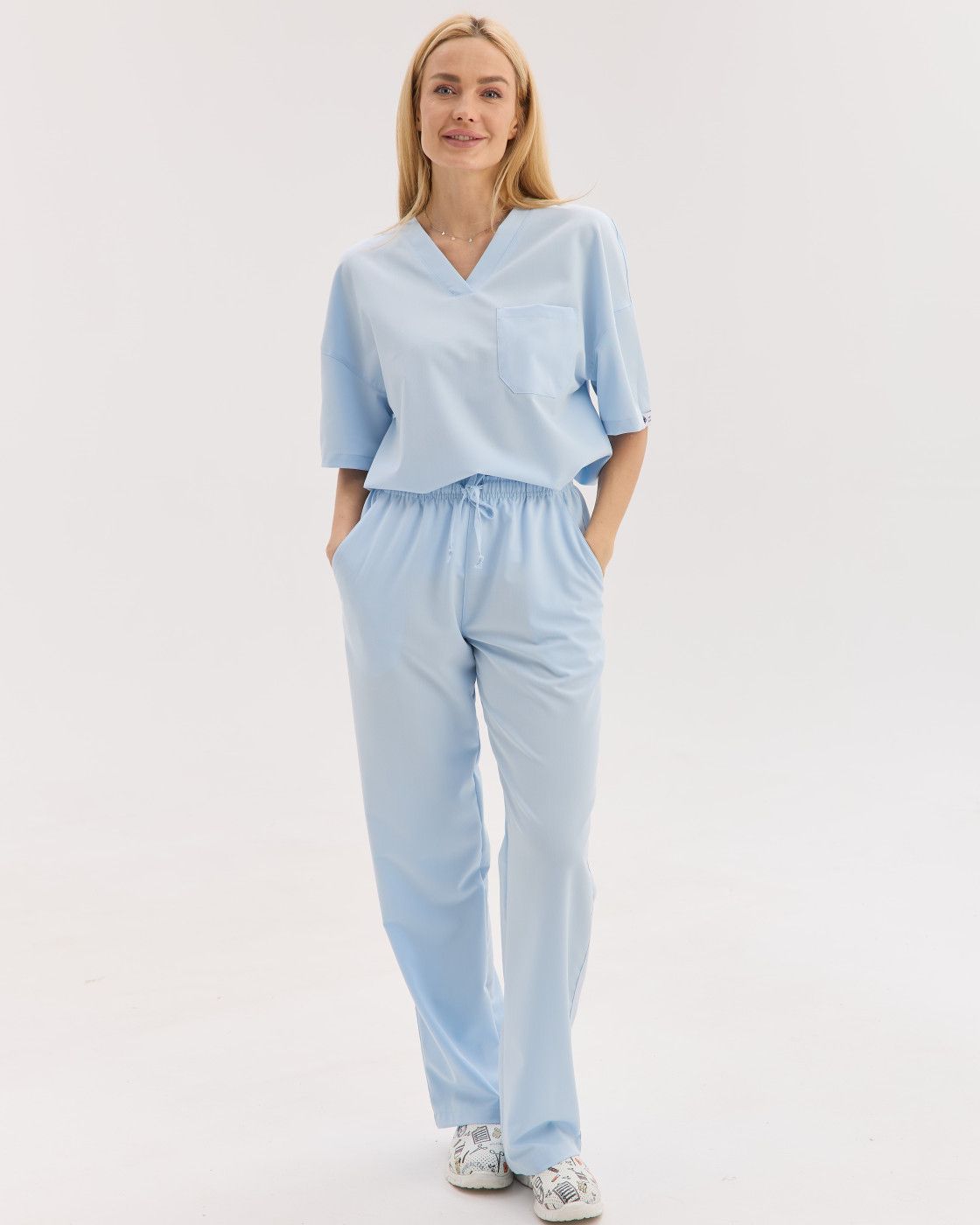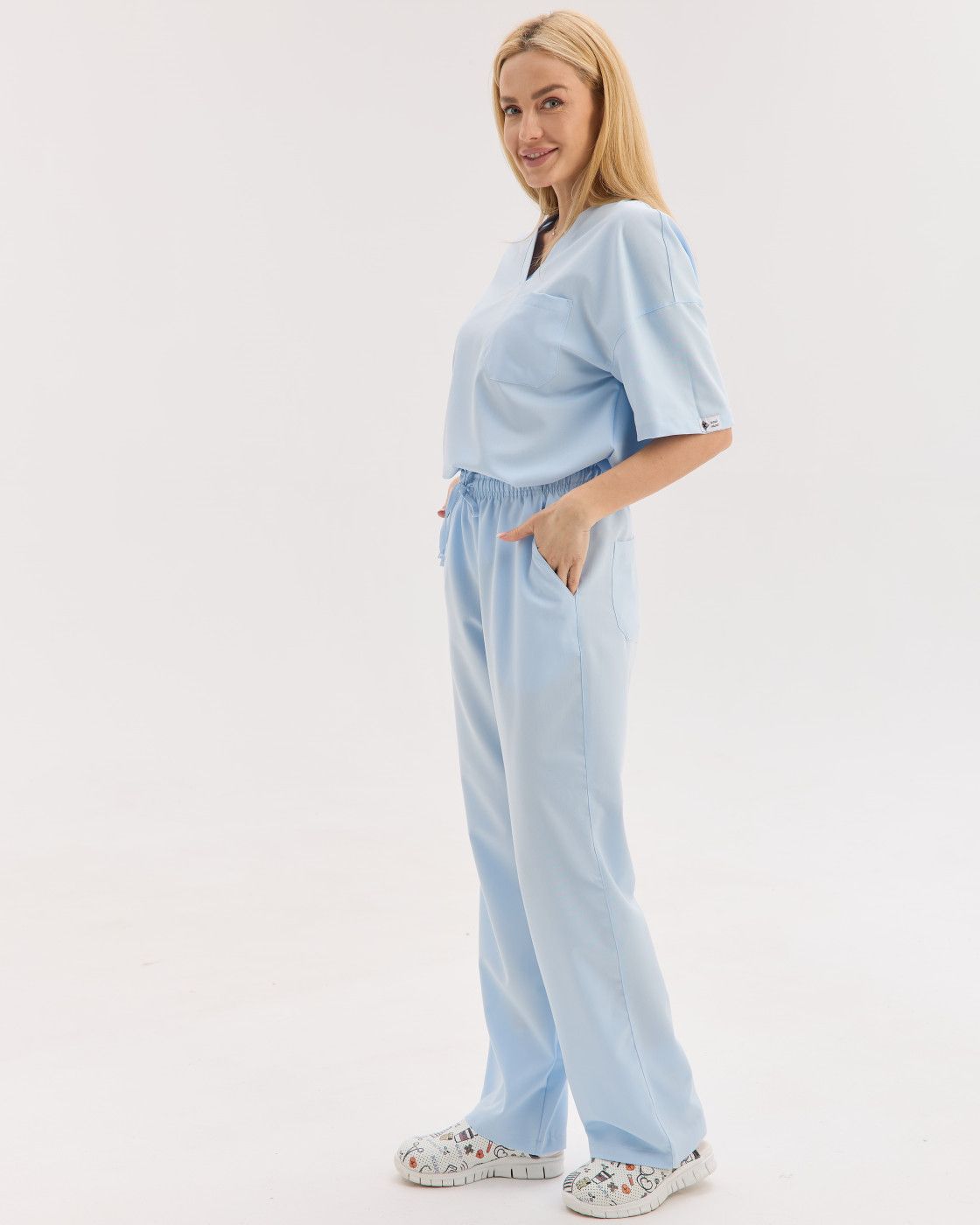 Костюм обеспечивает свободу движений, а ткань — мягкая, эластичная и износостойкая, сохраняет форму и опрятный вид даже после многократных стирок.