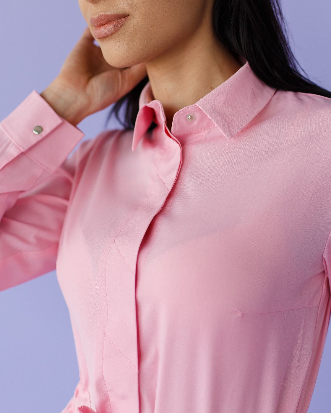 Рубашка имеет отложной воротник, два вместительных накладных кармана, а манжеты рукавов фиксируются потайными кнопками. Пояс-кулиска подчеркивает линию талии и при этом не сковывает движения. Низ — брюки прямого фасона с эластичной резинкой на талии и двумя карманами.