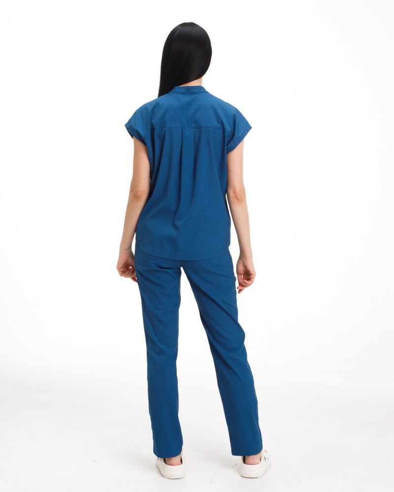 Рубашка свободного кроя с короткими рукавами и горловиной-стойкой на пуговицах. Есть 3 кармана — один нагрудный и два в области талии. Брюки свободного кроя с двумя карманами.