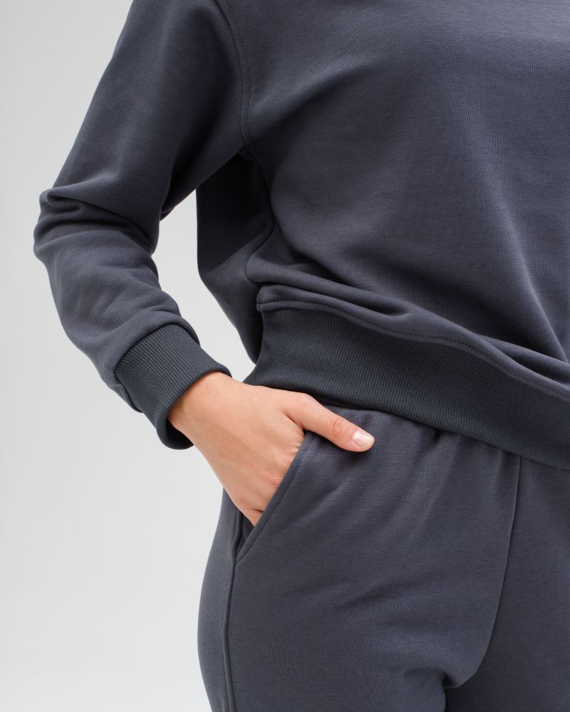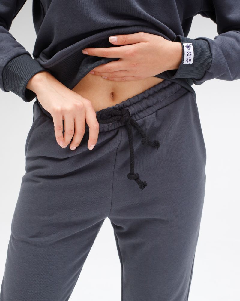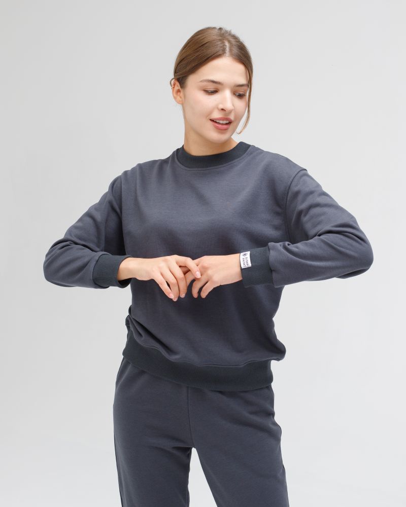 Состоит из медицинского свитшота и брюк. Женский костюм свободного силуэта, брюки с втачными карманами на манжетах, пояс на резинке с регулирующим шнурком; кофта с круглым вырезом, длинные рукава с опущенным плечом на манжете, низ кофты на манжете.